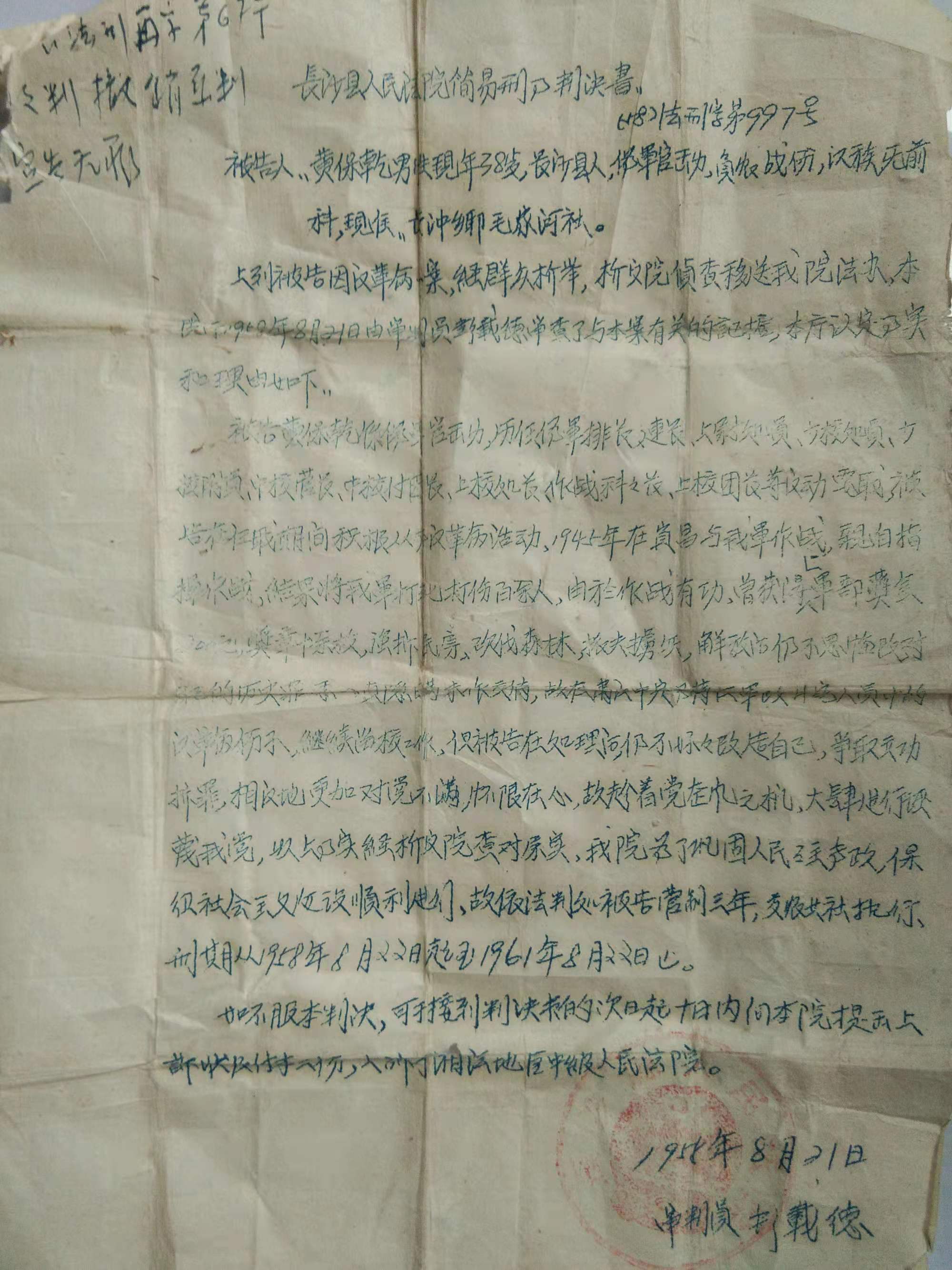 看过一张堪称文物的长沙县法院判决书。它的年份是五八年,上面的字迹依稀可辩。